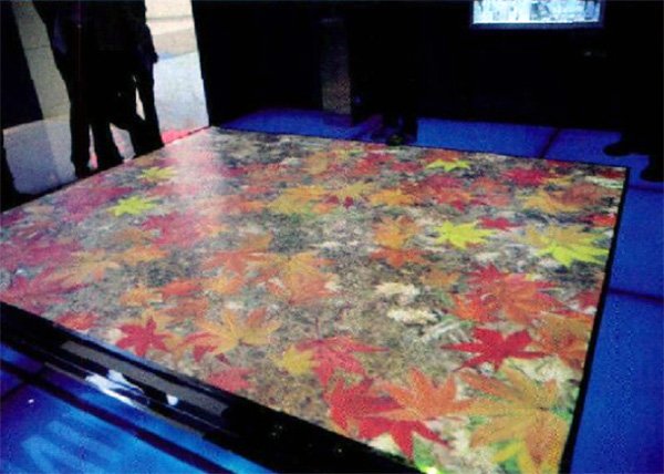 地面互動投影-展區(qū)里有塊IFLOOR互動投影系統(tǒng),它可以將任何的地板轉(zhuǎn)換成一個多點(diǎn)互動的表面。該系統(tǒng)通過智能圖像傳感器捕捉人體的運(yùn)動,軟件自動識別判斷人體的位置與運(yùn)動狀態(tài),并基于此產(chǎn)生不同層次的互動體驗(yàn)。在這里,既可以漫步在潺潺流水中,微波蕩漾;又可以徜徉在楓樹林中,體味”秋風(fēng)掃落葉” 的景致。